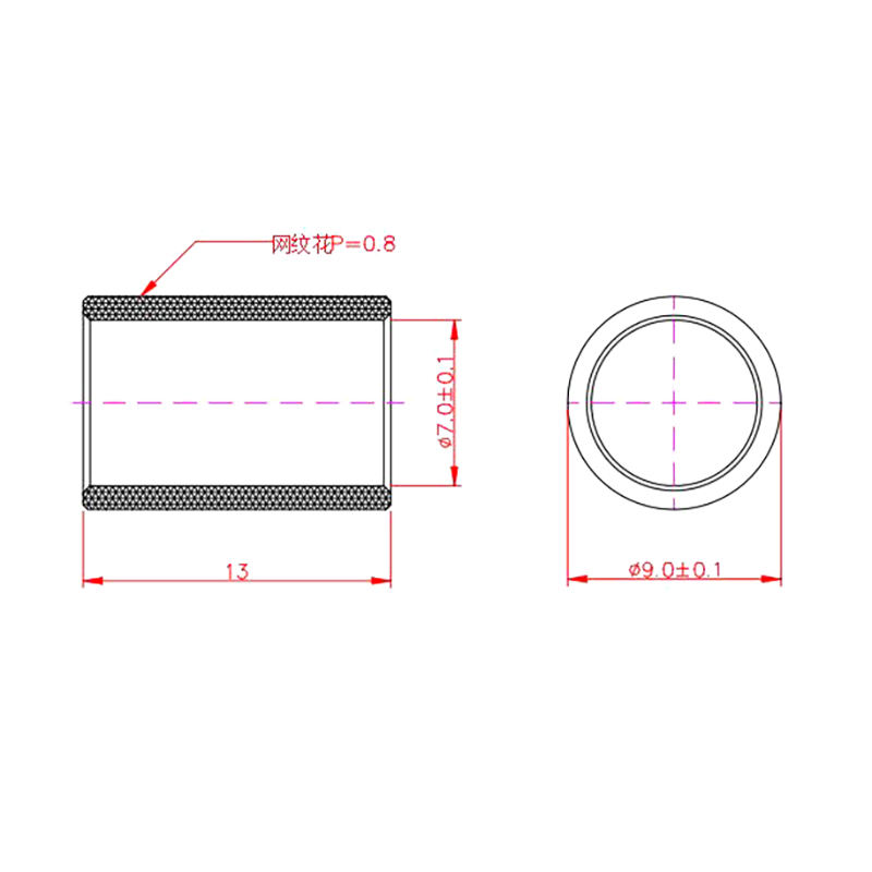 Made by turning with carbon steel material, a kind of bushing with pattern on the outer surface and round inner hole. Used for injection moulding into plastic parts, the pattern on the outer surface is conducive to enhancing the combination with plastic parts, increasing the overall strength of the parts and the degree of wear resistance, according to the needs of processing various specifications of such parts.